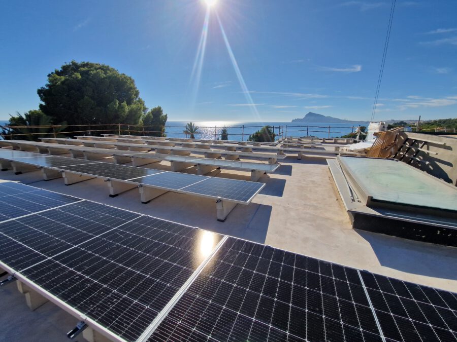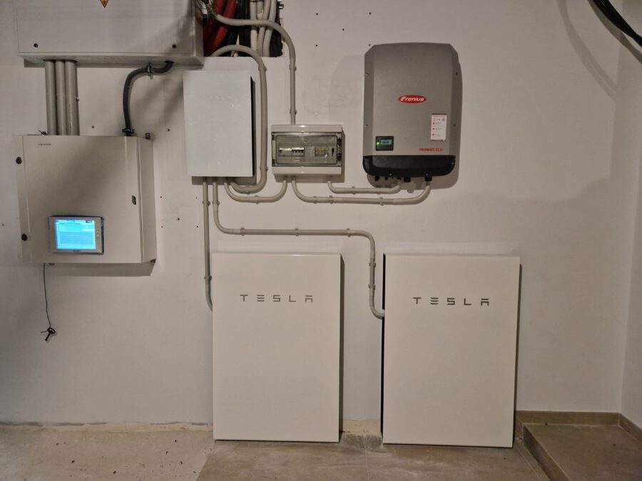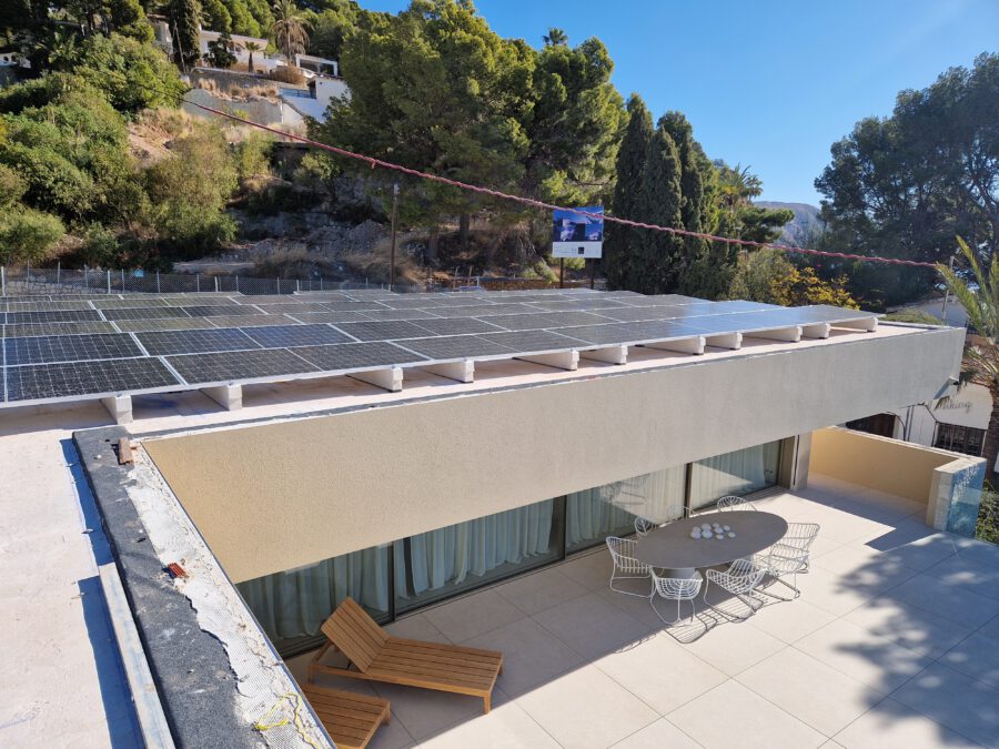 2️⃣ DEVELOPMENT: Equipped with a 24.2 kWp photovoltaic self-consumption system featuring Seraphim 550Wp panels mounted on a concrete structure with a 5-degree southwest-facing tilt, all discreetly concealed behind the parapet surrounding the roof. The minimal tilt, designed to avoid exceeding the wall’s height, is compensated by an additional array of panels. These panels feed into a 20 kW Fronius three-phase inverter and two Tesla Powerwall 2 batteries with a Gateway system. This setup ensures that the home’s essential facilities continue to operate even in the absence of grid electricity.