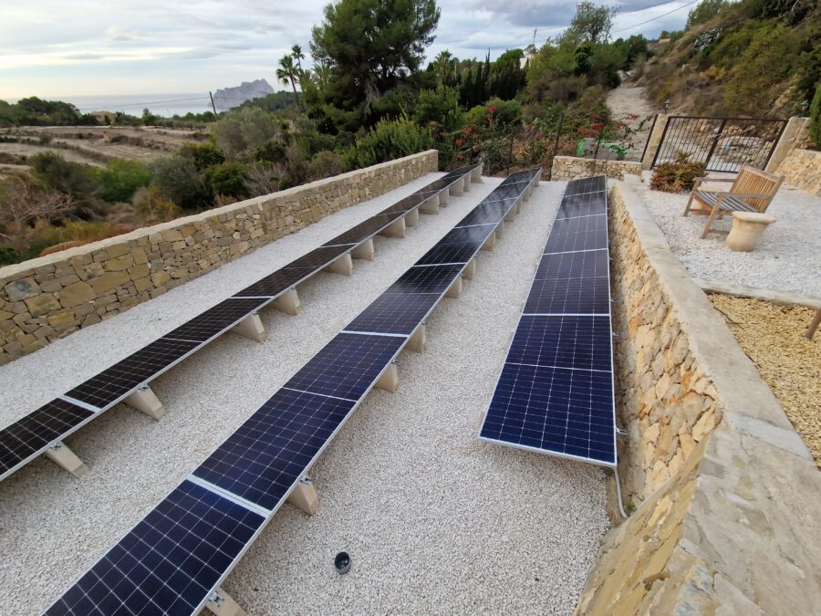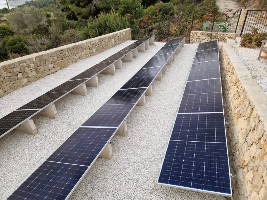 2️⃣ DEVELOPMENT: Equipped with a 9.9kWp self-consumption photovoltaic system, featuring 550Wp Seraphim panels mounted on a 20º concrete structure placed on level ground covered with gravel over an anti-weed mesh. The system includes a Huawei three-phase hybrid inverter, without an energy storage system.