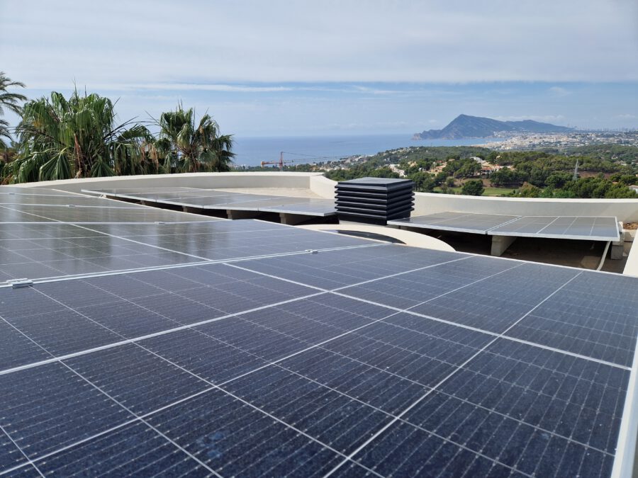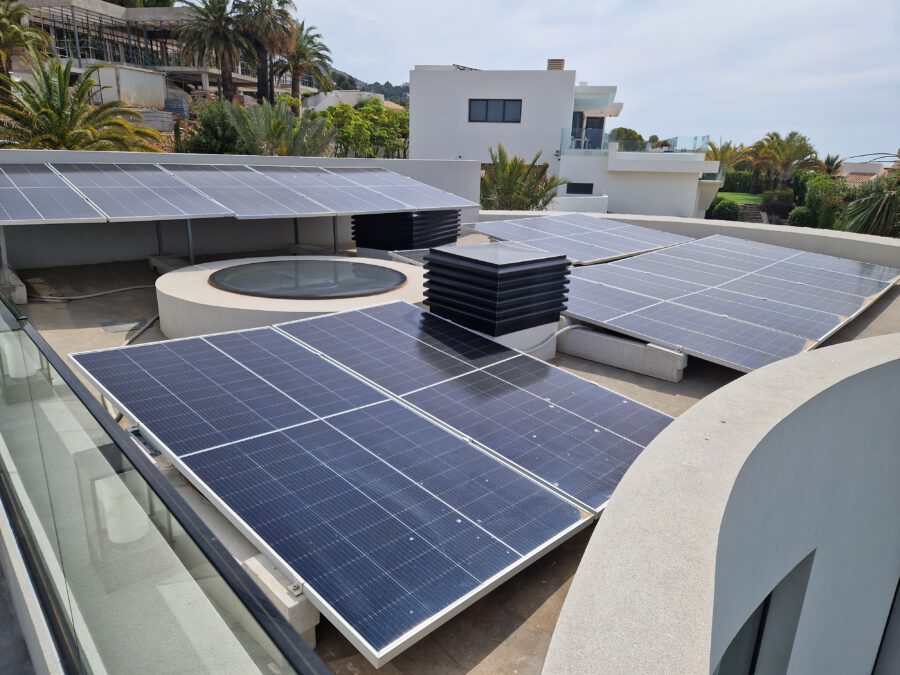 > BONUS: La vivienda cuenta con suelo radiante de gran potencia y un sistema de aire acondicionado en ambas plantas. La formas redondeadas de su construcción dificultan la ubicación de los paneles fotovoltaicos. Como en todos estos casos, el cliente exige que la instalación fotovoltaica sea invisible desde el exterior.