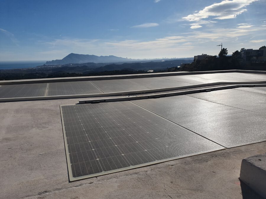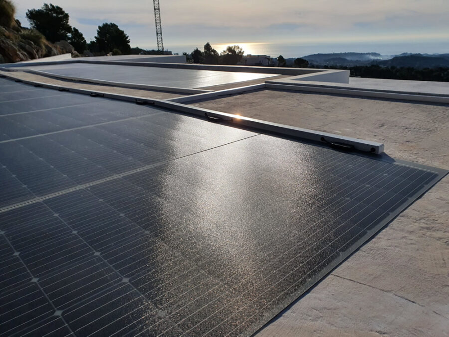 > BONUS: La vivienda cuenta con todo tipo de lujos y equipamientos, por lo que su consumo será elevado. Para evitarlo, se diseña una instalación fotovoltaica potente. El hándicap se encuentra en que la cubierta no transitable y plana carece de petos que puedan ocultar los paneles, por lo que se decide utilizar paneles ligeros y flexibles que se adapten al suelo, directamente adheridos para evitar perforaciones y dañar la impermeabilización.