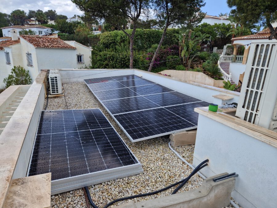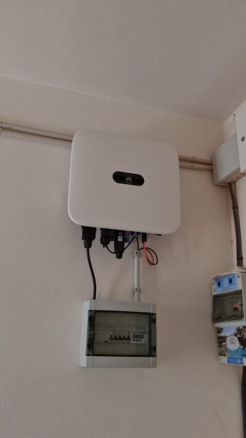 2️⃣ DESARROLLO: Equipada con un sistema de autoconsumo fotovoltaico de 5,500kWp con paneles Seraphim de 550Wp sobre estructura de hormigón, homologada y posada en el suelo de la cubierta. Inversor híbrido (en previsión de baterías) de la marca Huawei, 4 de los paneles llevan optimizadores de la misma marca.