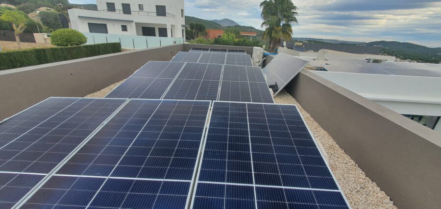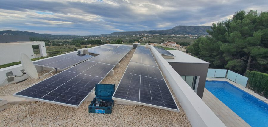 1️⃣ CONCEPTO: Vivienda de lujo de nueva ejecución, con espectaculares vistas. Cubierta plana con previsión de conductos, pero con maquinaria de aire acondicionado y antenas, que dificultan y dejan el espacio justo para la instalación fotovoltaica. Por ello, otra vez, los cálculos y mediciones tienen que trabajarse muy bien para encajar los paneles solares que se necesitan.